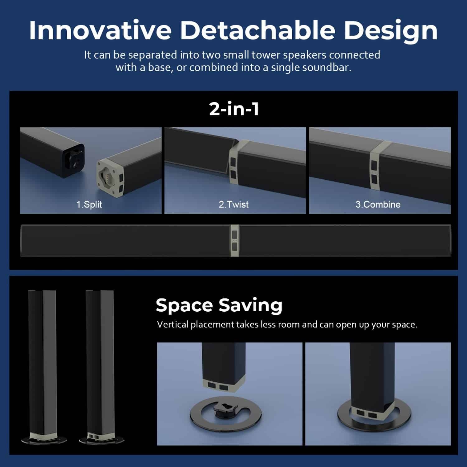 It can be separated into two small tower speakers connected with a base or combined into a single soundbar.