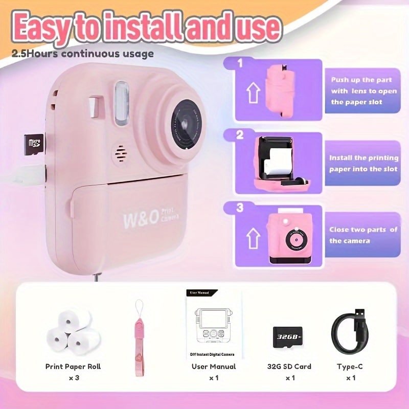 Quick three-step paper installation and 2.5 hours of continuous use; includes print paper rolls, 32GB SD card, and Type-C cable.
